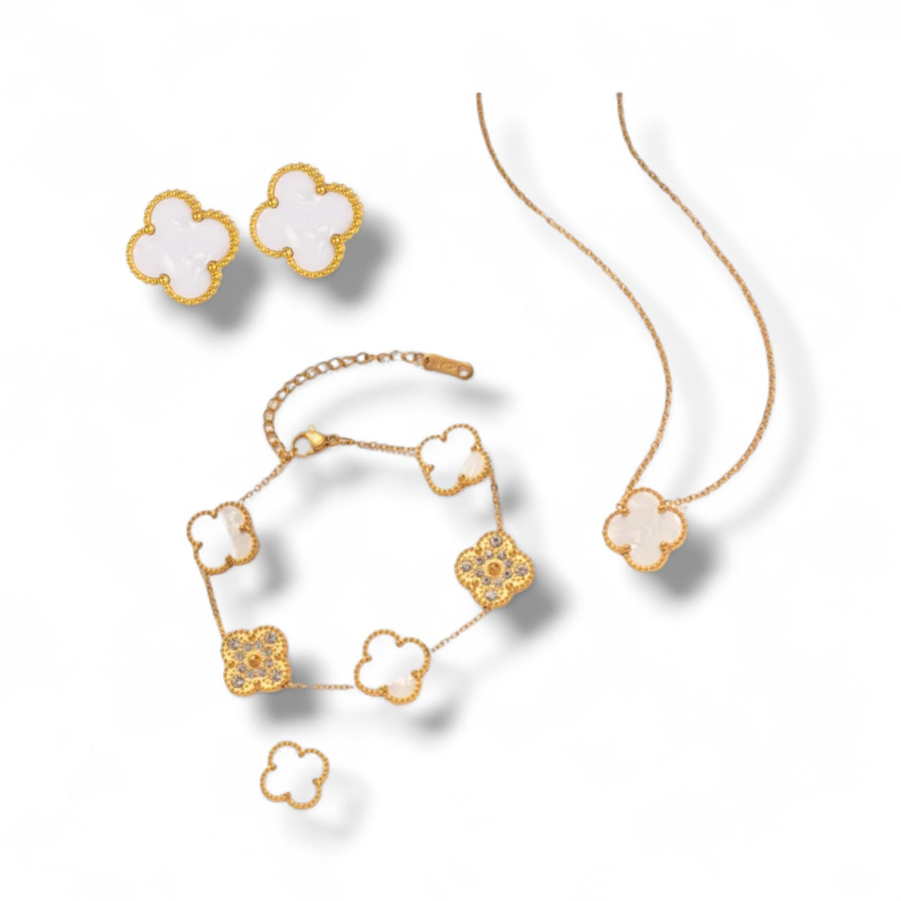 This jewellery set is a beautiful and unique addition to any collection. The set features a clover design that is both stylish and meaningful. The clover design is double-sided, allowing for versatility in wearing the set with different outfits. The clover design is also a symbol of good luck and prosperity, making it a meaningful addition to any jewelry collection.