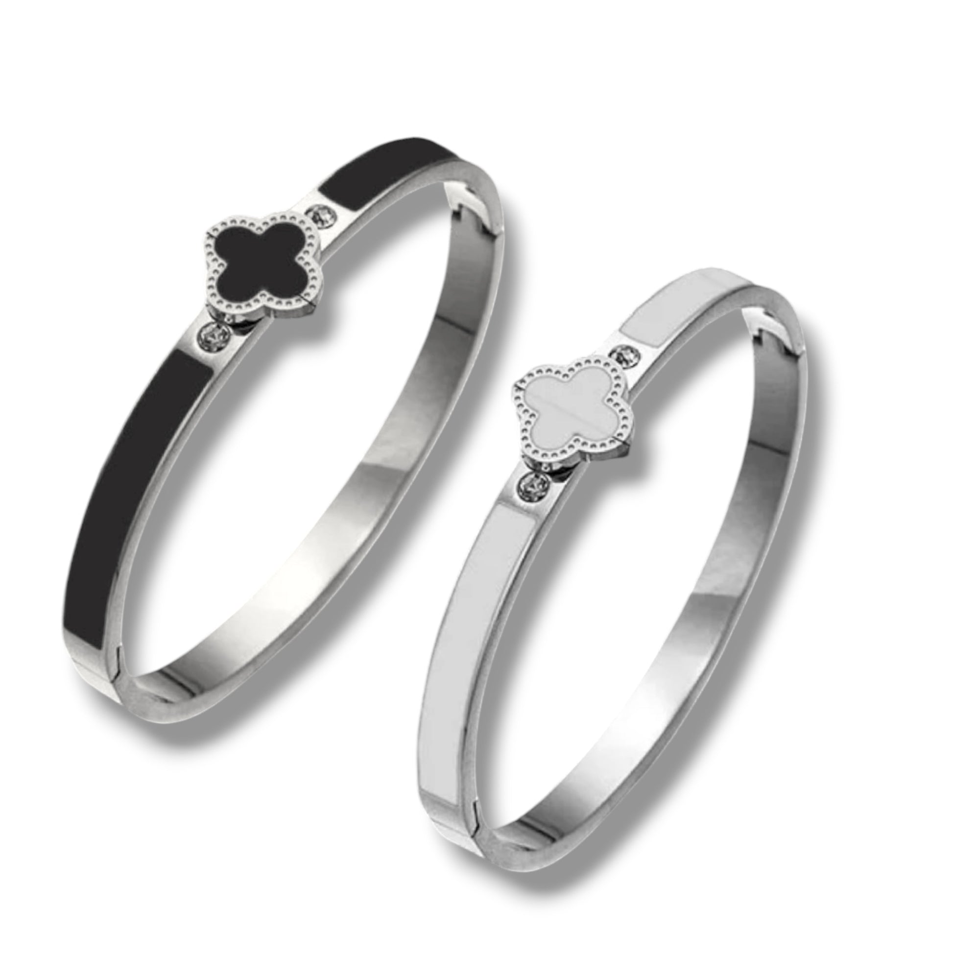 Add some luck to your style with the Silver Nadia bangle! This stainless steel bangle features a classy clover design, bringing a touch of charm to any outfit. Perfect for adding a playful and unique touch to your everyday look.